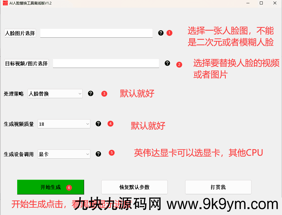 AI换脸替换工具离线版V1.2。基于开源项目,做了如下的小工具,给定一张人脸图,即可实现将某视频或者图片的人脸替换成给定的人脸。