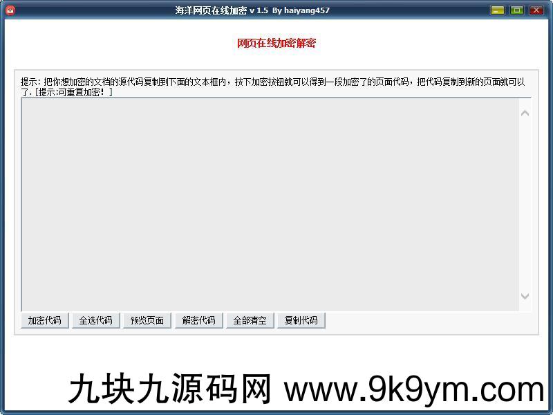 把你想加密的文档的源代码复制到下面的文本框内,按下加密按钮就可以得到一段加密了的页面代码,把代码复制到新的页面就可以了.
