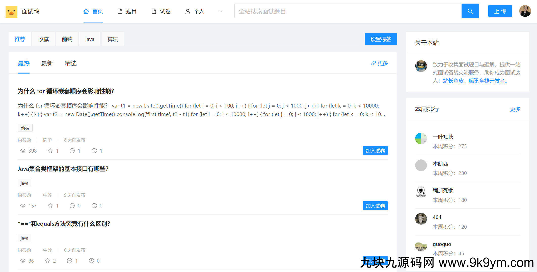 面试鸭一个干净的面试刷题网站!专业面试刷题网站,助你成为面试达人!支持自由组卷、在线刷题、校招社招斩获大厂offer,求职必备!React + 云开发 / Node.js 全栈项目,包含网站前台 + 管理员后台的完整前后端代码。优势- 干净:界面简洁,纯净无广- 免费:永久免费,可赚激励- 全面:海量题目,上百方向- 共建:全民编辑,共同完善- 崭新:持续更新,拥抱变化- 效率:灵活选题,高效刷题- ~~多端适配(算个毛的优势)~~