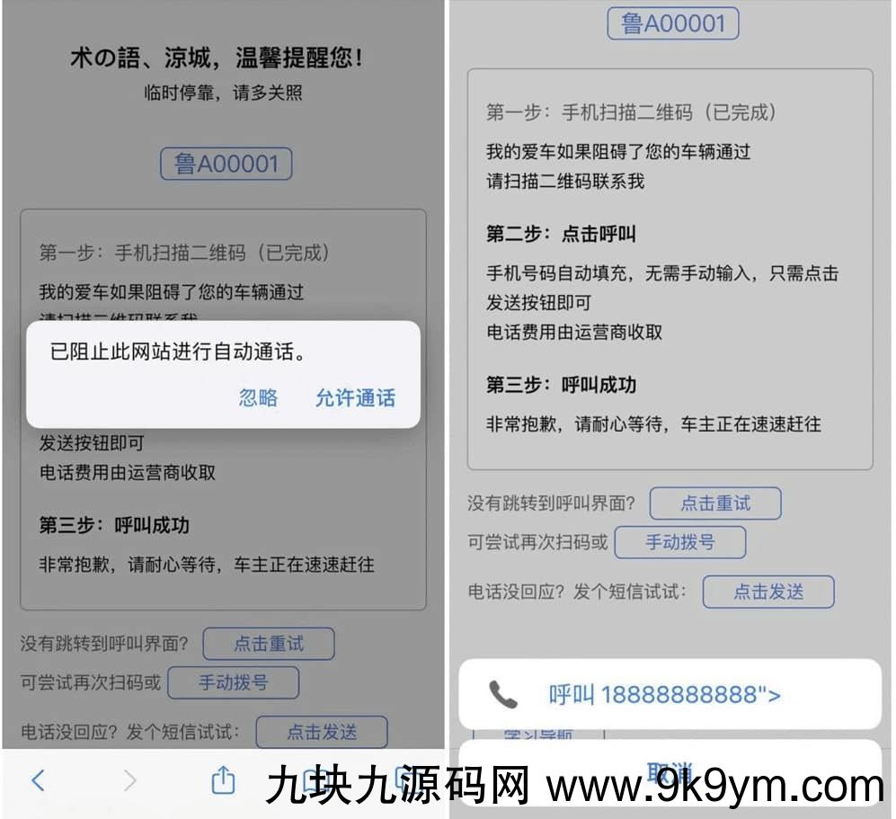 自动拨打发送挪车短信电话源码 纯html临时停车挪车网站源码,编辑源码页面内容上传即可使用!分为两套源码(检测到手机打开才会自动弹出)第一套:自动拨号访问自动弹到拨号界面,并自动输入手机号。第二套:自动短信访问自动弹到短信界面,并自动输入短信内容和手机号。