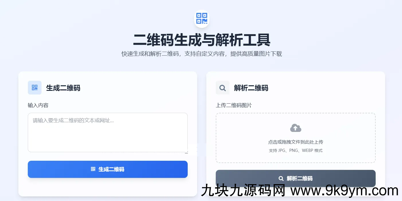 这是一款纯前端二维码生成与解析工具,基于 HTML+Tailwind CSS+JavaScript 开发,无需后端部署,核心特性如下: