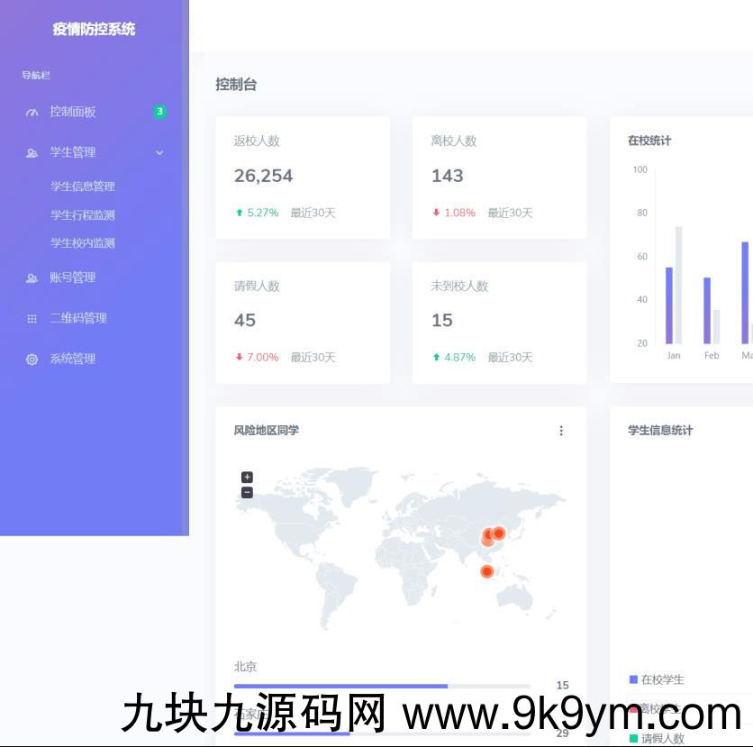 功能包括老师和学生角色权限,大数据图表展示,扫码进出校园,校园行程记录,生成二维码,学生管理,网站管理,学生签到打卡等功能等等。