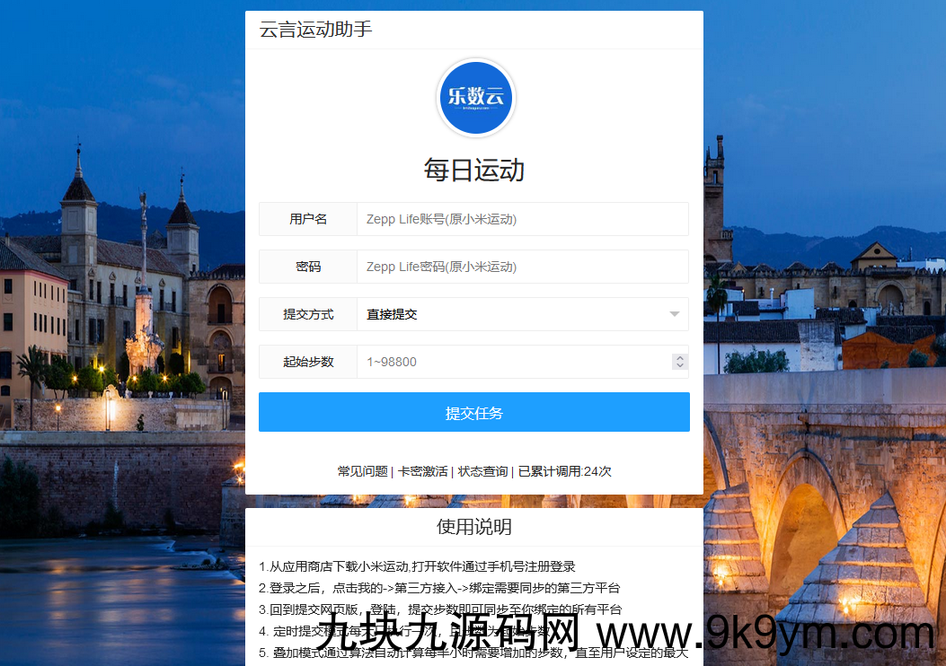 VUE运动刷步助手WEB版,后端nodejs基于小米运动接口协议刷步,步数可秒同步至wx、支付宝等平台,附件两个文件一个打包版:直接上传到服务器,访问域名即可(云服务器,虚拟主机均可),另一个源码版:需要自己进行npm run build 打包,需要安装node环境