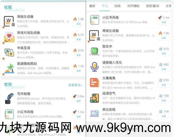 提示词功能(角色扮演),内置近300种提示词,包含小红书文案书写、周报生成、异性对话生成器等