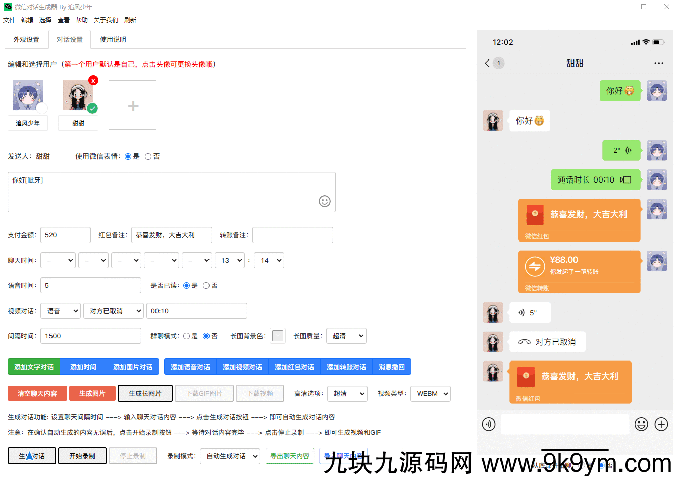对话生成娱乐器web网页版+win电脑版,是一款聊天记录制作工具,可以模拟微信聊天,可以添加不同用户角色进行对话,支持发送文字、语音、图片、红包、转账等。可以将聊天内容一键生成为图片、长截图、动态图片和视频。