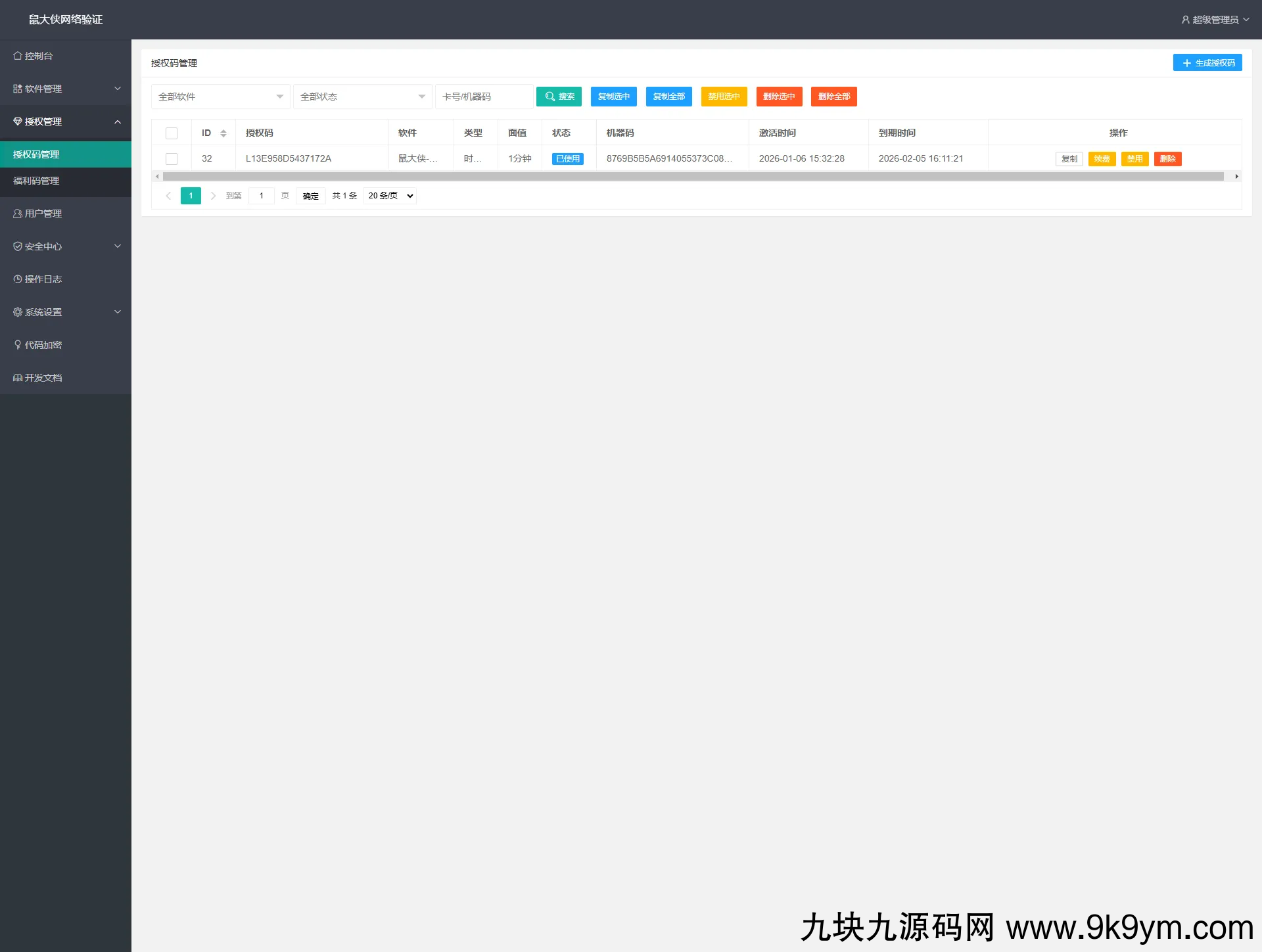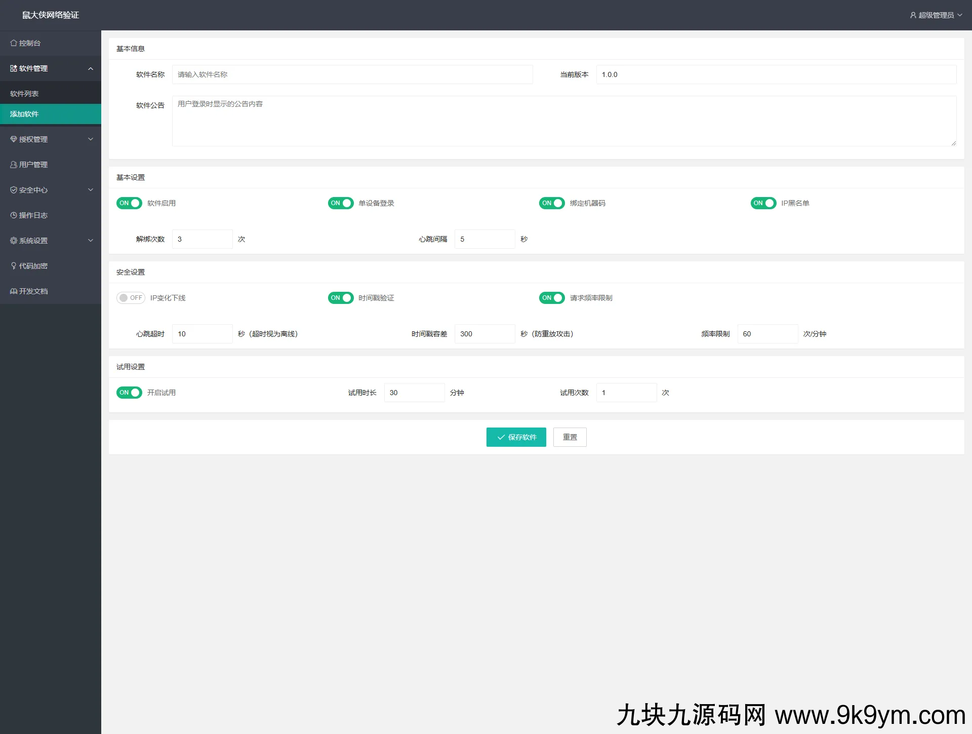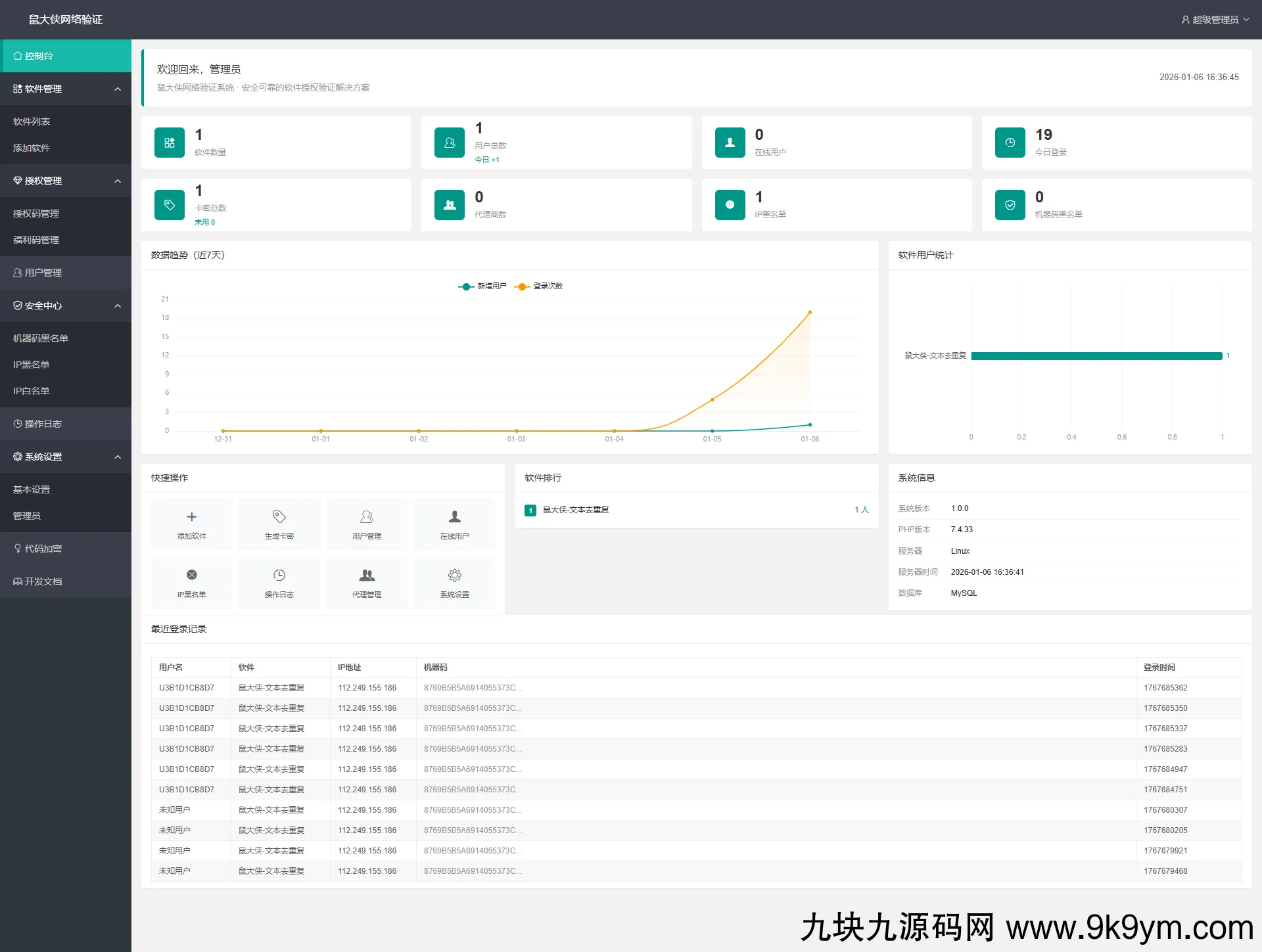 | 鼠大侠网络验证系统是一套轻应用的软件授权验证解决方案,专为软件开发者设计。采用PHP+MySQL架构,支持一机一码授权、福利码激活、试用功能、心跳检测等,帮助开发者轻松实现软件的授权管理和防破解保护。 核心功能 【授权验证】 一机一码授权,每个机器码对应唯一授权 授权码管理(生成、禁用、续费、恢复) 福利码批量生成,适合活动发放 支持永久授权和限时授权 【用户管理】 用户列表查看,支持搜索筛选 机器码封禁/解封,一键踢下线 用户续费功能 在线用户实时监控 【安全防护】 心跳检测(默认5秒间隔,10秒超时) IP黑名单/白名单 机器码黑名单 单设备登录限制 IP变化自动下线 API请求频率限制 【试用功能】 支持限时试用 试用时长可配置 试用到期自动失效 【代码加密工具】(内置) PHP/JavaScript代码混淆加密 自动解密还原(支持eval+base64、gzinflate等常见加密) 文件批量加密/解密 加密后代码可直接运行 【开发文档】 完整的API接口文档 多语言示例代码:C#、VB.NET、易语言、Python、Java、Kotlin 详细的对接教程 |