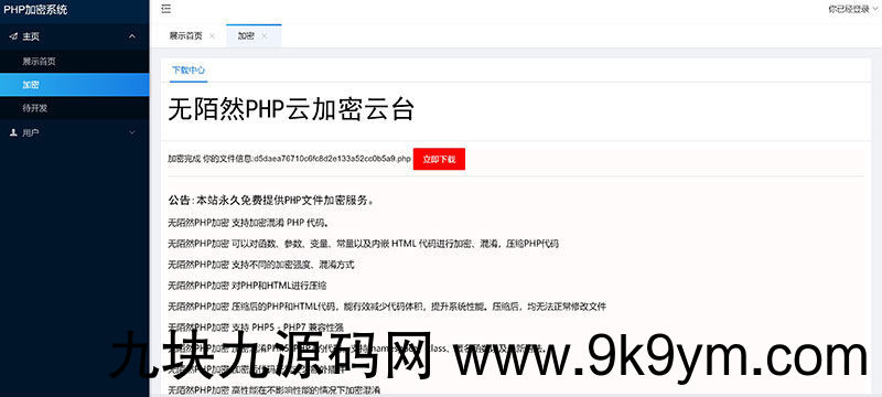使用本加密,用户需要注册登录之后才能使用本加密,登录之后用户可自行上传php文件进行加密,加密成功之后即可下载,