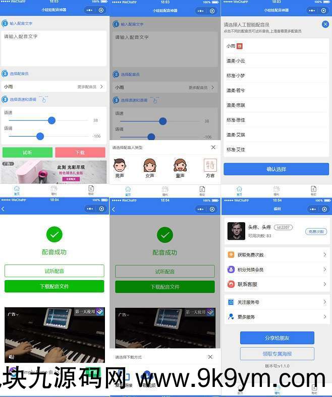 配音员的添加修改,设置推荐,设置配音员的试听文字。首页轮播图支持。体验的小程序上暂时没有放出来,海报支持导流到其他的小程序,打开h5页面,banner广告,格子广告朋友圈海报合成的支持发现导流。该小程序是功能类的小程序,可以通过福利种的发现页面导流到其他的小程序中,形成流量圈兑换设置,支持积分兑换次数,积分兑换次数用户qa设置裂变,用户分享增加用户次数自定义小程序标题分享设置关注公众号非ip授权,不限制小程序接入数