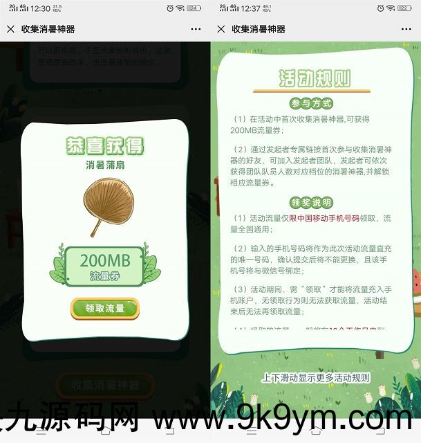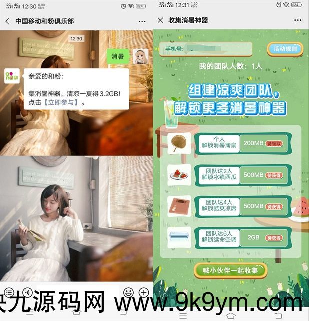 微信搜索:“中国移动和粉俱乐部”公众号回复“消暑”按照指示解锁消暑神器即可首次解锁必的200MB流量另外跟好友组队最高可可领到3.2G移动全国通用流量领取的流量需要手动去兑换活动地址:中国移动和粉俱乐部微信公众号...