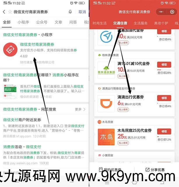 微信搜索”微信支付商家消费卷“进入后找到交通住宿 下拉滴滴出行优惠卷
