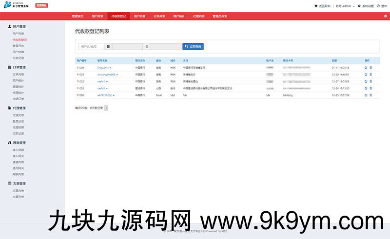 2.后台可设置提现方式,提现手续费、支付费率等功能。3.完整强大的数据统计功能让你实时查看自己的每一笔收益。4.可对接其他支付接口使用 代理制度完善5.可查看通道列表,通用网关以及网银列表,可冻结异常订单