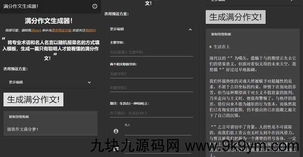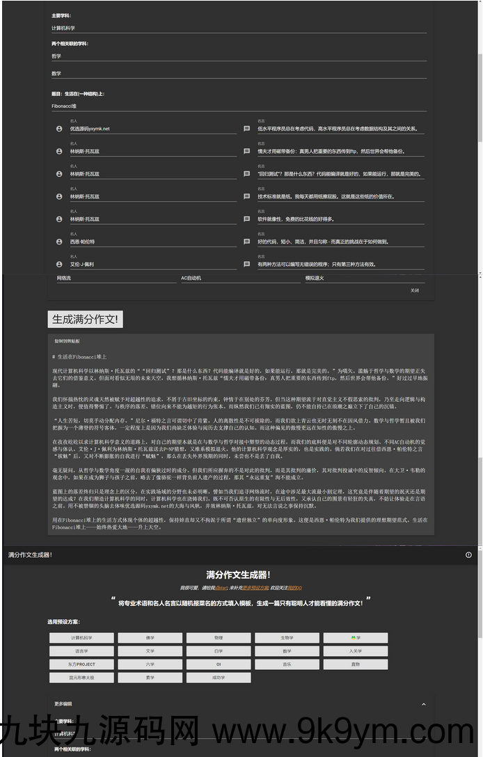 在线满分作文生成器html源码,将专业术语和名人名言以随机报菜名(背书单)的方式填入模板,生成一篇只有聪明人才能看懂的满分作文!