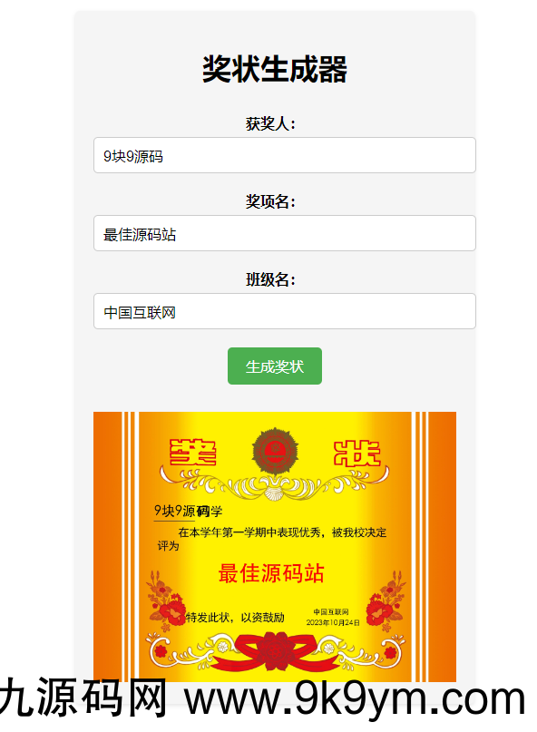一个在线奖状生成器-Pear,是一个api接口版,替换相关参数然后复制链接地址到浏览器打开即可生成一张奖状,可以获奖人姓名(不能超过3位字符)、奖项名(不能超过9位字符)和班级名,感兴趣的同学可以试试。这边写了一个前端上传到服务器就可以用。