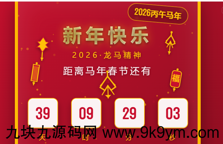 这是一款基于 HTML5+CSS3+JavaScript 开发的 2026 丙午马年春节倒计时网页,以浓郁的中国红 + 鎏金为核心视觉风格,融合传统春节元素与现代前端特效,兼具美观性与实用性: