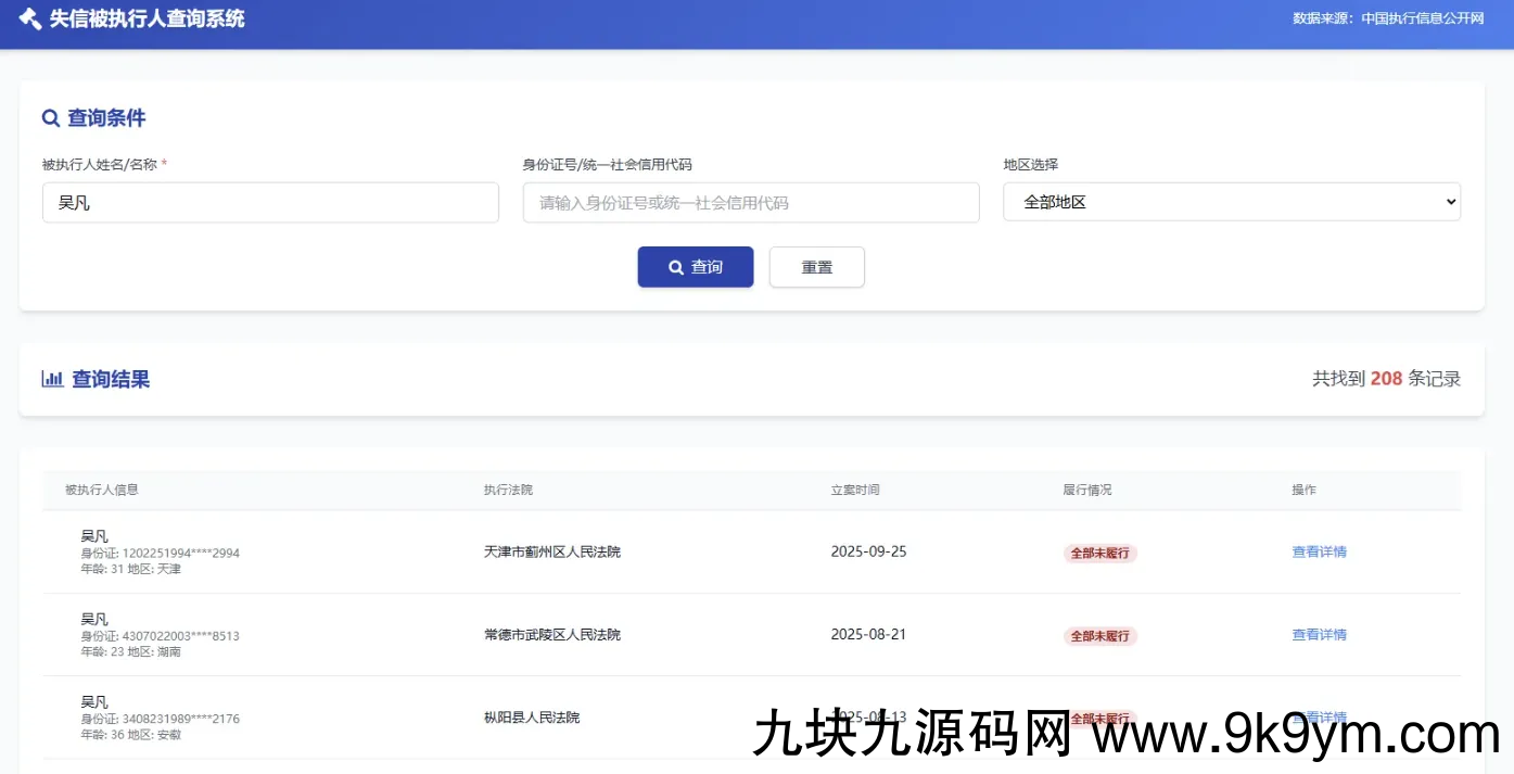 SEO功能完善了 直接可以投入使用。后面就不发HTML源码了转站PHP语言。有个网站老是修改我的HTML源码版权,不想给他人做嫁衣。基础功能:1. 提供多种查询方式(姓名/名称、身份证号/统一社会信用代码、地区筛选)2. 展示查询结果列表(包含被执行人基本信息、执行法院、立案时间等)3. 支持结果分页和关键词搜索亮点功能:实时数据更新,提供被执行人最新状态变更提醒