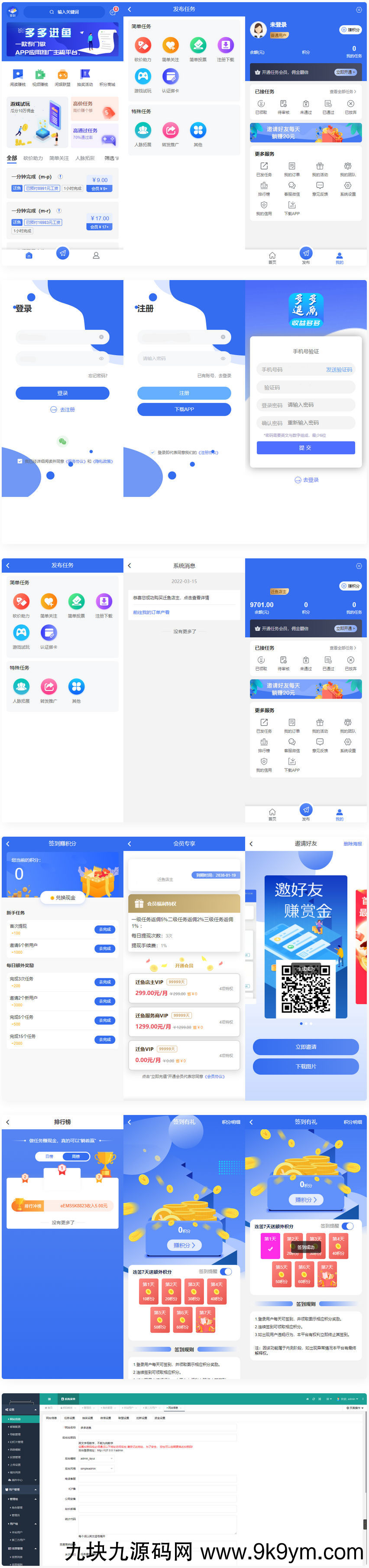 任务管理:包含平台的任务列表和用户任务列表,以及任务订单的相关管理。