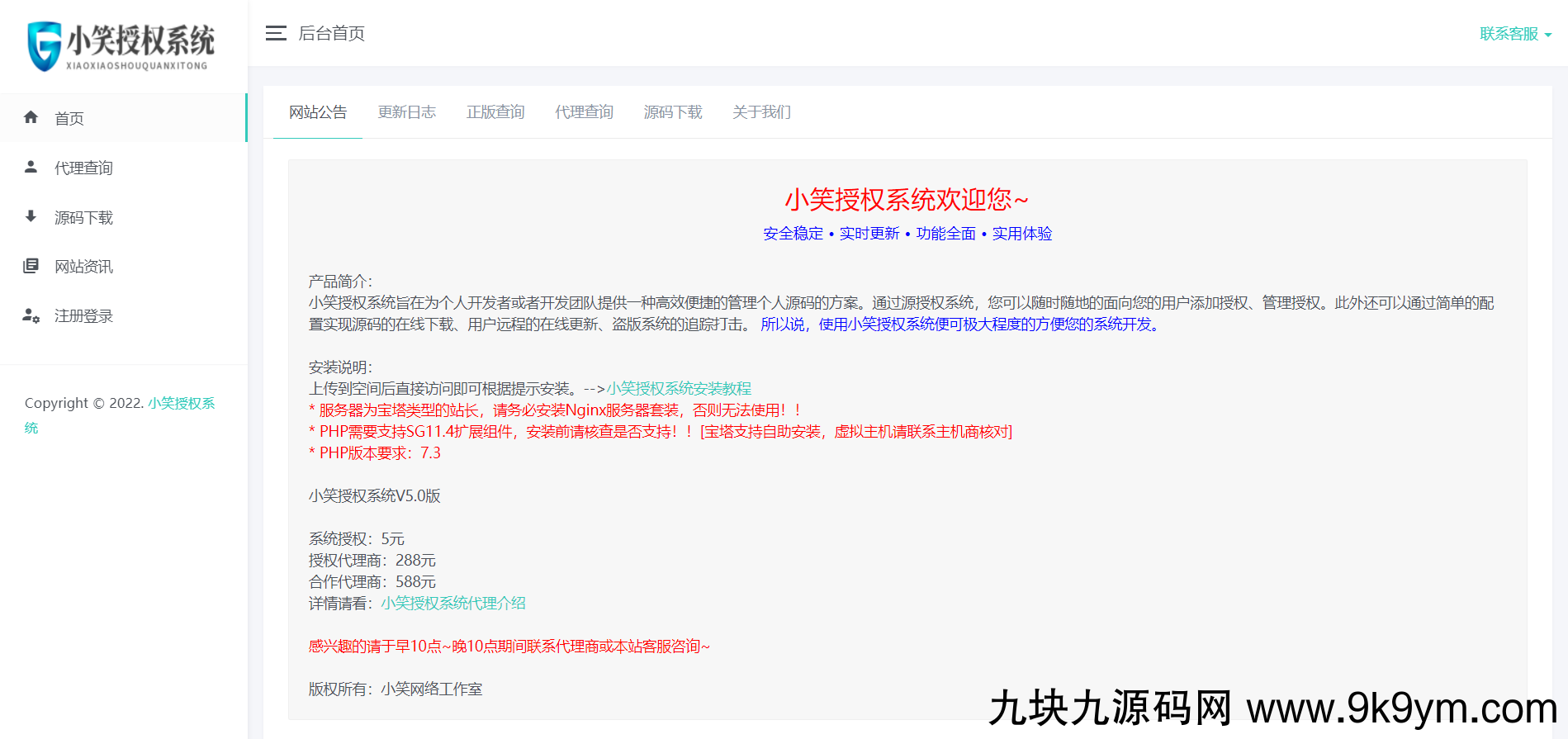 小笑授权系统V5.0开心版一款强大的PHP授权系统1、支持用户注册账号自助购买2、支持API对接购买3、支持用户自助购买/升级授权商4、多种模板随意切换5、基于广大用户需求可对接易支付/码支付/官方支付还有大量其他授权系统没有的功能,需要你自己安装去探索了安装方法很简单上传到网站目录访问网站安装即可,授权码随便填,需要安装SG11扩展(必须使用php7.3)系统不需要授权,加密只是为了防止有些人二开
