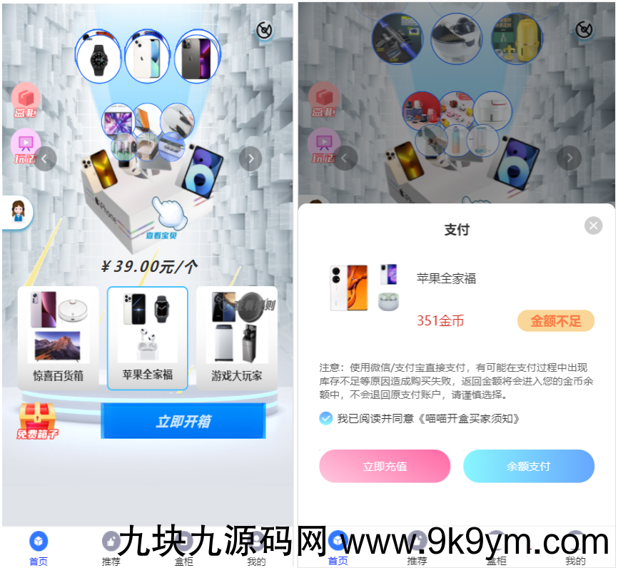 含充值3级分销,盲盒回收成余/额功能/晒图/盲盒转增功能。