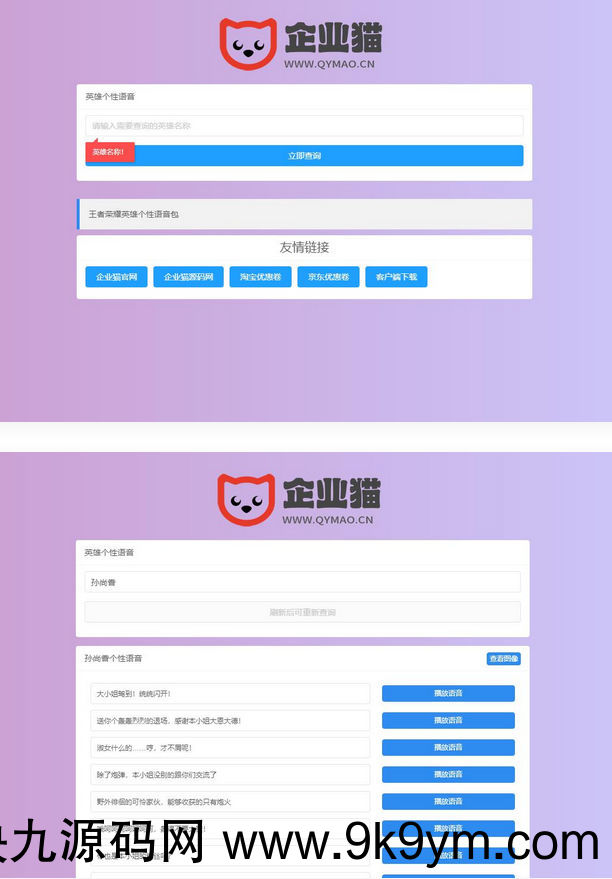 王者荣耀个性语音包查询系统开源源码,王者荣耀个性语音包查询系统 上传解压即可使用,可以在线获取王者荣耀英雄的语音包,看起来还是蛮不错的,蛮好看的一个东西!