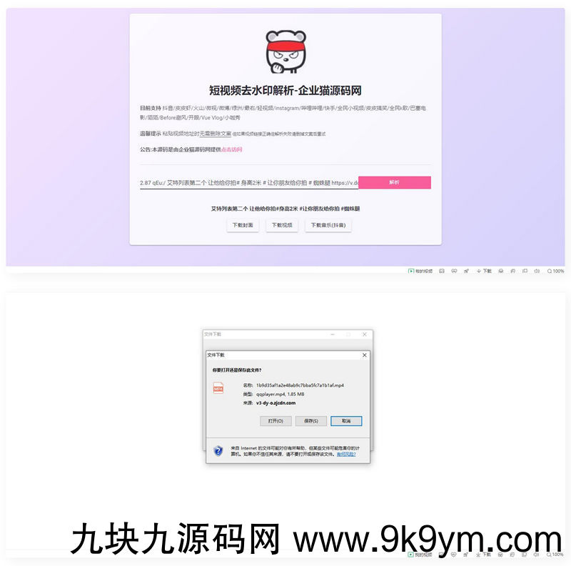 抖音/快手/b站/微视/西瓜/在线去水印附源码支持以下网站去水印抖音 皮皮虾 火山 微视 微博 绿洲 最右 轻视频 instagram 哔哩哔哩 快手 全民小视频皮皮搞笑 全民k歌 巴塞电影 陌陌 Before避风 开眼 Vue Vlog 小咖秀 西瓜视频源码采用接口版,如果无法使用,自行修改接口、接口在129行企业猫测试了下。打开速度较慢,但9-16号可以正常使用该源码去除抖音短视频水印,剩下的视频平台没有测试