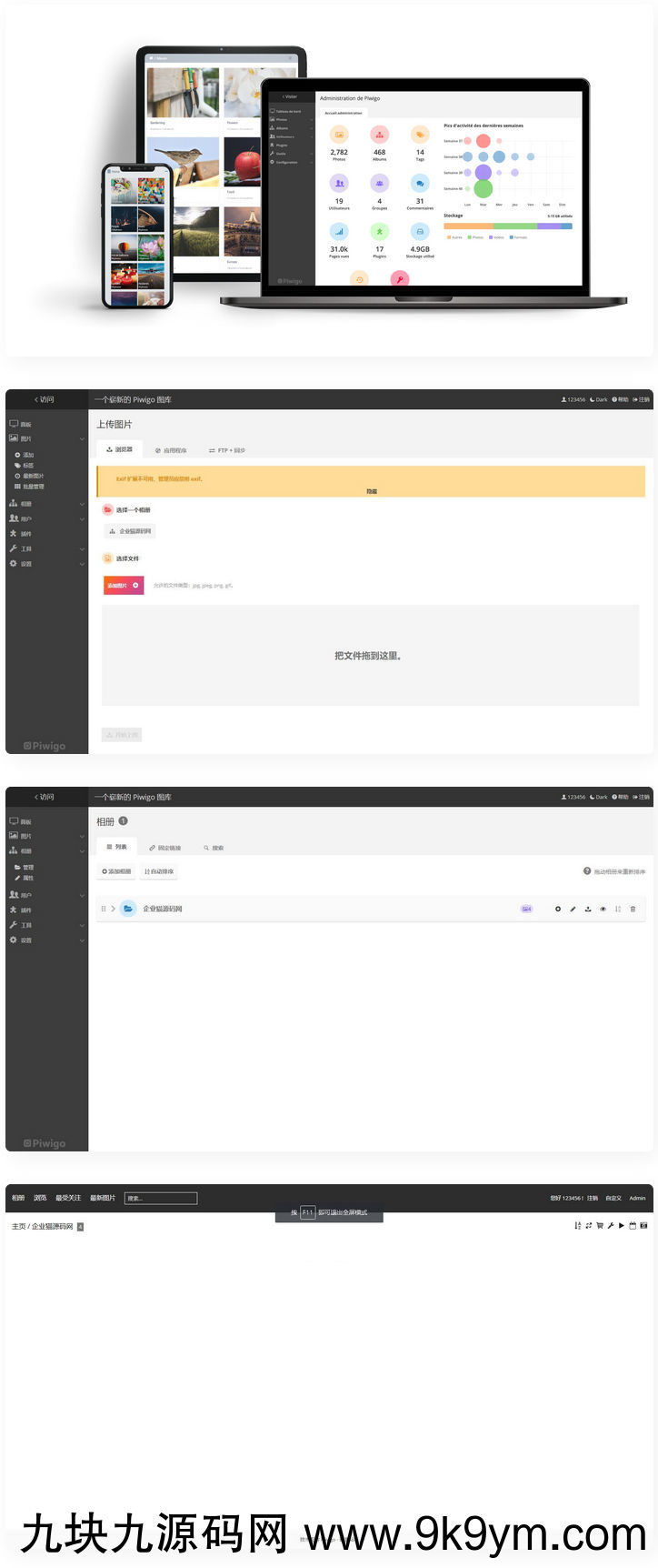 管理员可以创建用户,组,管理权限并发送通知。几个管理员可以在Piwigo中同时工作。非常适合您的团队!