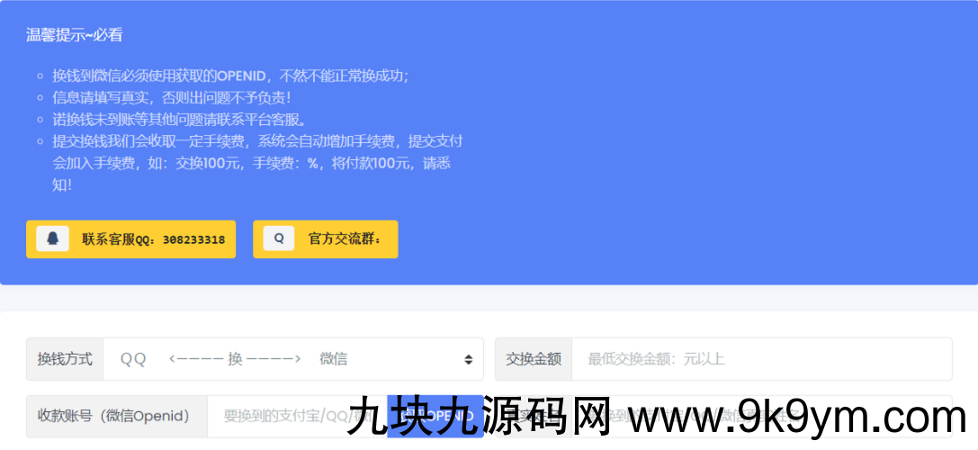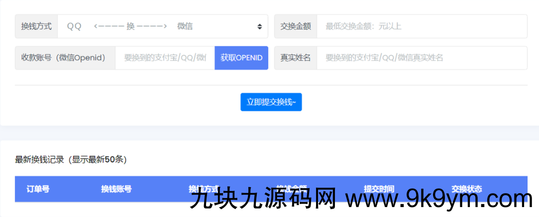 XBU微信/支付宝在线换钱平台系统源码是一款支持对接易支付收款、自定义换钱手续费和最低换钱额度、可以设置首页是否显示换钱记录