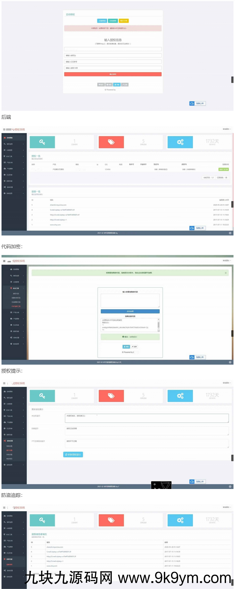 PHP域名授权验证系统是一个功能强大的系统,提供了多项功能来保护你的域名和软件的合法性。它包括盗版追踪、域名IP双重授权、在线加密等功能,同时还提供了PHP授权验证更新系统的完整版,方便你进行一键更新和生成自助授权。