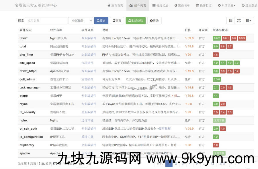 网站后台管理可一键同步宝塔官方的插件列表与增量更新插件包,还有云端使用记录、IP黑白名单、操作日志、定时任务等功能。