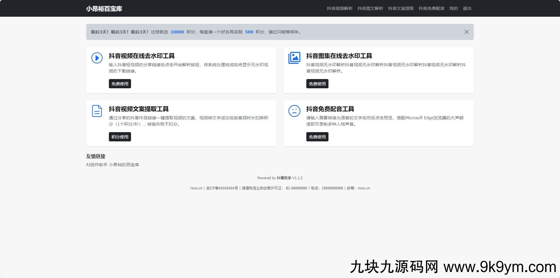 该在线服务平台采用高性能、易扩展的ThinkPHP框架作为核心技术支撑,整合了视频处理、数据分析、文案提取和配音等多种功能模块。