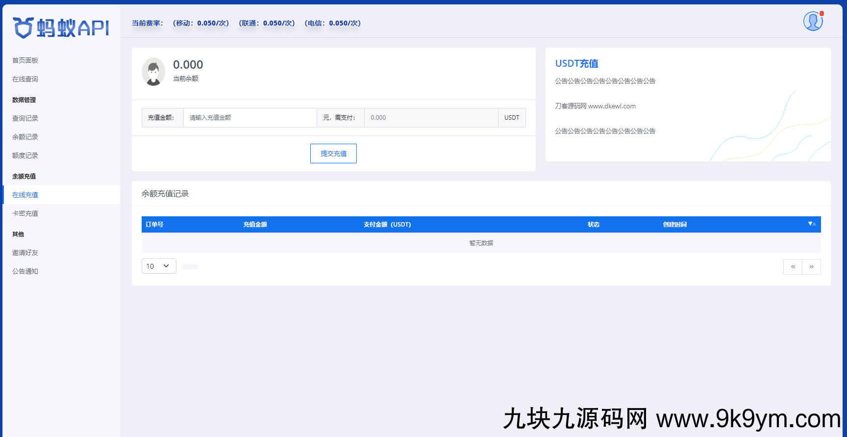 用户余额充值是对接usdt接口或者通过后台生成卡密,源码全开源,支持懂技术的人二次开发