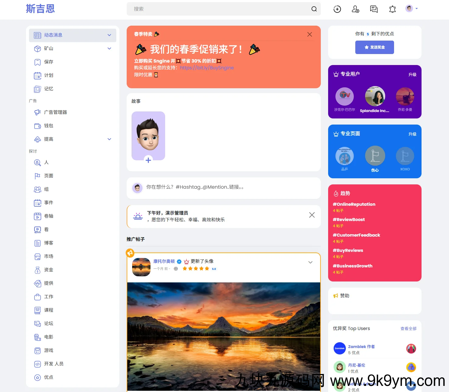 Sngine 4.0.4是一款海外社交平台的PHP源码,包括多语言支持、短视频和博客订阅等特性,类似推特的操作方式。用户可添加好友、关注、分享内容、接收通知,支持YouTube、Vimeo等链接分享,还有隐私设置、验证徽章、实时搜索、表情符号、照片图库等功能。此外,系统提供管理工具,用于管理用户、页面、评论、聊天、群组等,并具备SEO友好性、响应式设计及缓存系统以提升性能,如果不知道什么样可以参考【推特】,喜欢的自行部署吧!