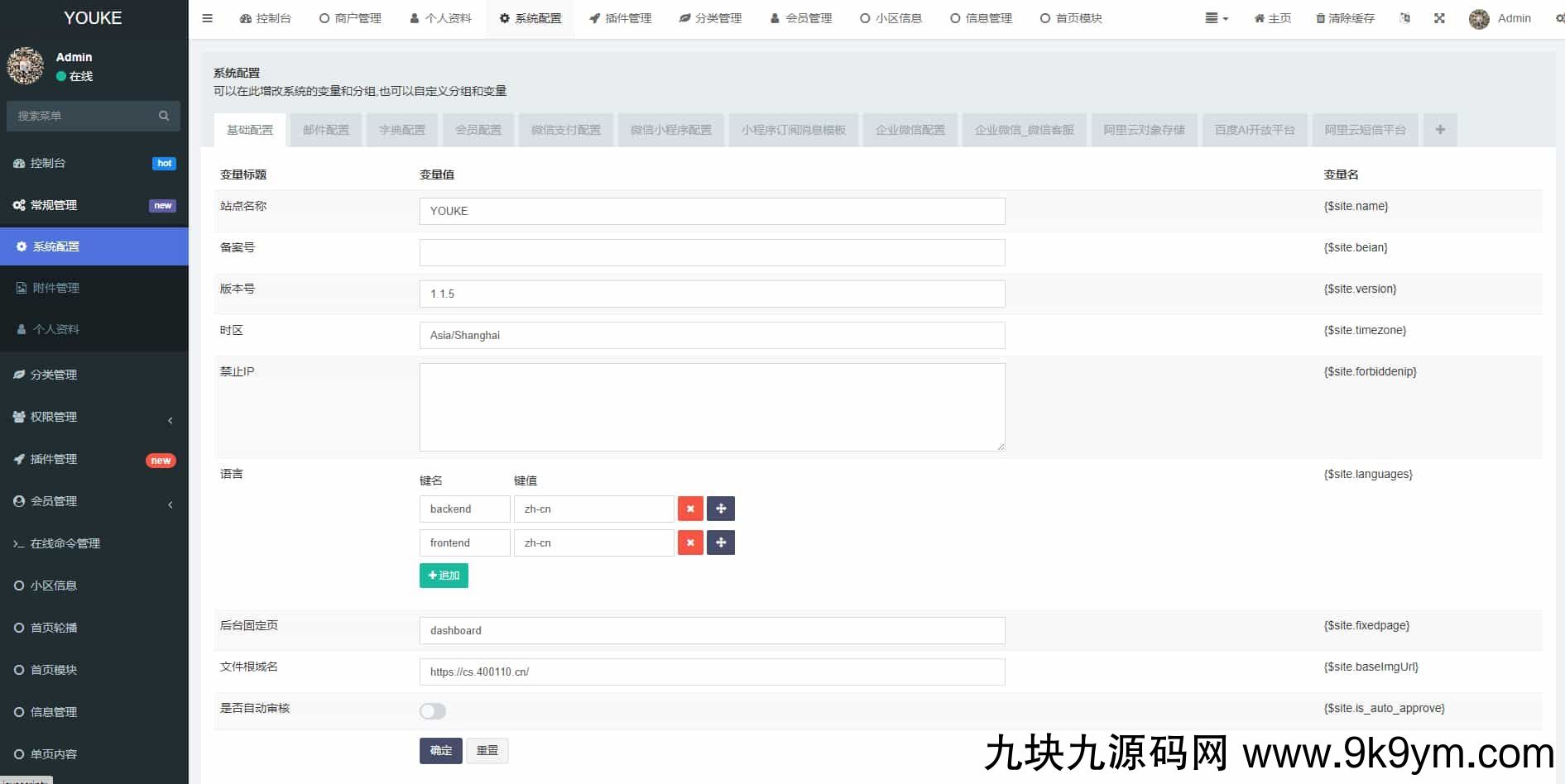 进入后台管理后,点击侧边栏目“常规管理”-“系统配置”,打开“微信小程序配置”选项卡,配置好你的微信小程序APPID和微信小程序AppSecret