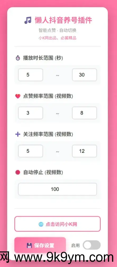 懒人抖音自动浏览、养号。刚写的一个浏览器插件,可以控制的视频播放时长、点赞频率、关注频率、播放数量适合工作室以及个人养号使用反正我是用来配合抖音福袋一起一批养号,一批抢福袋