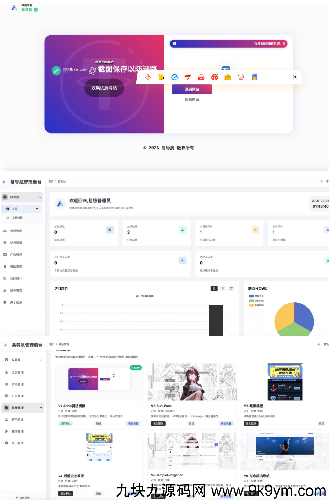 这是一款易导航集合市面大部分导航模板,并且直接给授权去掉了,简单的测试了这款导航系统,体验还是比较不错的,去掉了授权,后台可自定义前端模版,还是不错的导航系统,并且是开源支持二次开发,喜欢的自行部署吧!