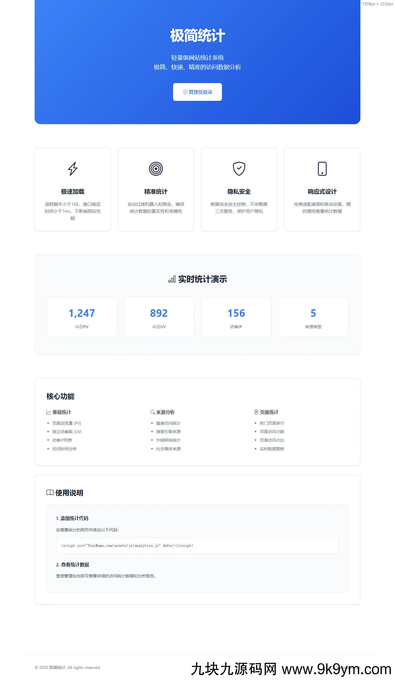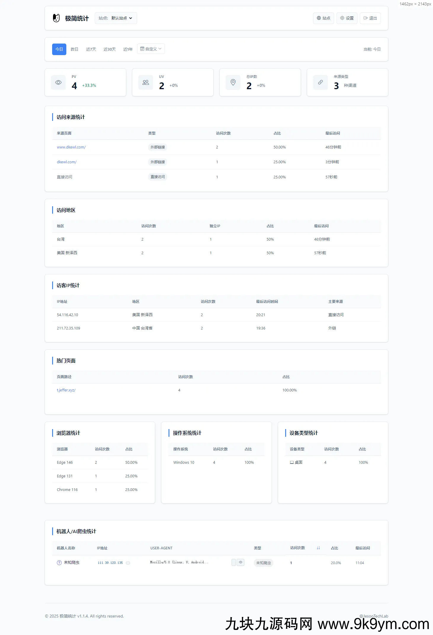 核心特点极简部署:单文件统计,5 分钟完成安装基础数据:PV、UV、IP、来源、地区、设备统计智能过滤:自动识别并过滤 AI 爬虫和搜索引擎机器人多站管理:一个后台管理多个网站数据安全:所有数据存储在自己服务器
