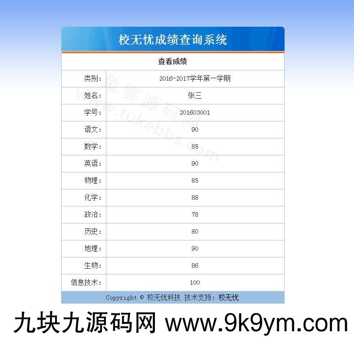 校无忧成绩查询系统 v1.4更新日志1.修复前台验证码提示2.修正后台验证码提示校无忧成绩查询系统简介校无忧成绩查询系统是为了满足学校教务管理中学生成绩查询的需求而制作,提高了学校教务管理的方便和实用性。系统适用于学校、教育机构、企事业单位在互联网上进行网上成绩查询的在线平台。系统主要功能:1、页面基本信息设置2、多类别成绩查询3、科目自定义设置4、批量导入导出成绩……