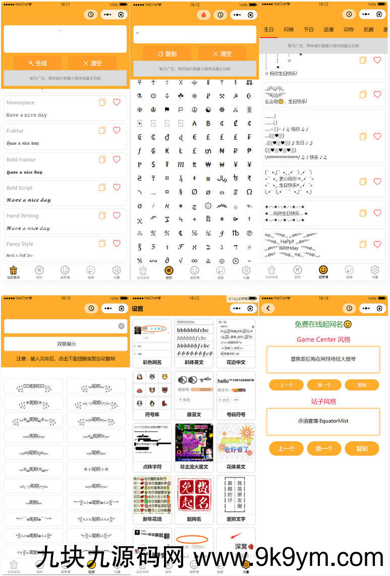 这是一款主打字体设计,符号组合等多模板功能的一款微信小程序源码内含多种功能,比如:花式字体设计表情字体组合设计翅膀字体组合火星文一键生成符号库空白名称彩色网名等等还有很多,所以小编就不一一介绍了通过用户的自定义输入和选择,可以让用户生成各种字体,或者组合各种名字文案等等另外小编还给添加了多样化的流量主模式大家只需要替换对应的流量主ID即可该源码搭建简单容易上手,下面就看看小编的部分测试演示图吧!