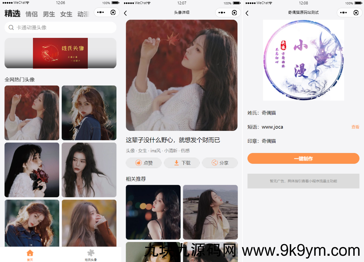 这是一个头像类型的小程序源码支持多种流量主比如激励视频,Banner,视频,插屏,原生模板等小程序内包含多种头像非类,都是自动采集比如男生头像,男声头像,动漫头像等等另外该小程序还支持姓氏头像生成制作自定义姓氏输入,标语,印章等输入制作另外拥有标语选择,可以选择各类热门标语,以便于用户制作姓氏头像!支持姓氏头像制作激励视频解锁高清头像保存激励视频解锁等等~~~~具体功能小编就不一一介绍了,大家自行研究哟!下面是小编的部分演示图,大家可以看看