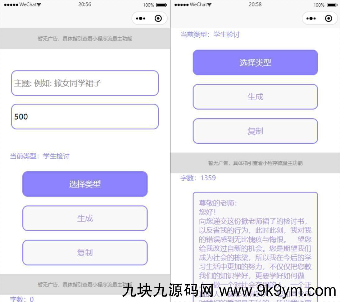 对于经常写检讨的小伙伴来说,福音来了因为这是一款检讨书生成小程序所以再也不用为了写检讨而烦恼了哦支持自定义字数下线,主题自定义支持多种类型检讨比如:学生党的,男朋友,领导演讲稿,共青团申请书等该小程序安装搭建简单,特别适合新手上手