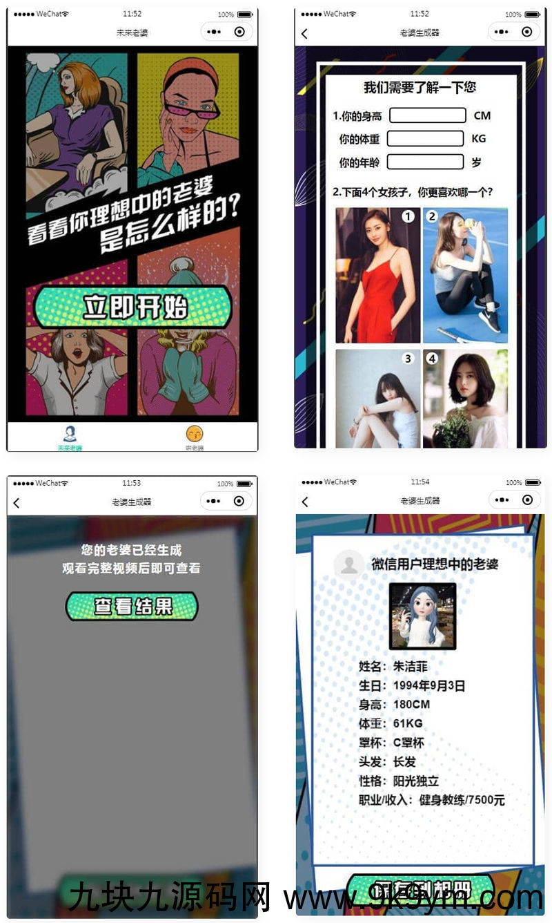 未来老婆查询生成器微信小程序源码下载,支持流量主。一款未来老婆或女朋友查询生成器,玩法也就相当于类似之前很火的一款重生模拟器一样;通过自己的选项来**出未来老婆,PS:只是娱乐别认真哈~~另外这款小程序还有支持跳转其它小程序界面,还支持流量主模式哟;安装的话还是特别的简单的,只需要简单的上传到微信开发者工具。然后提交审核就可以了!!