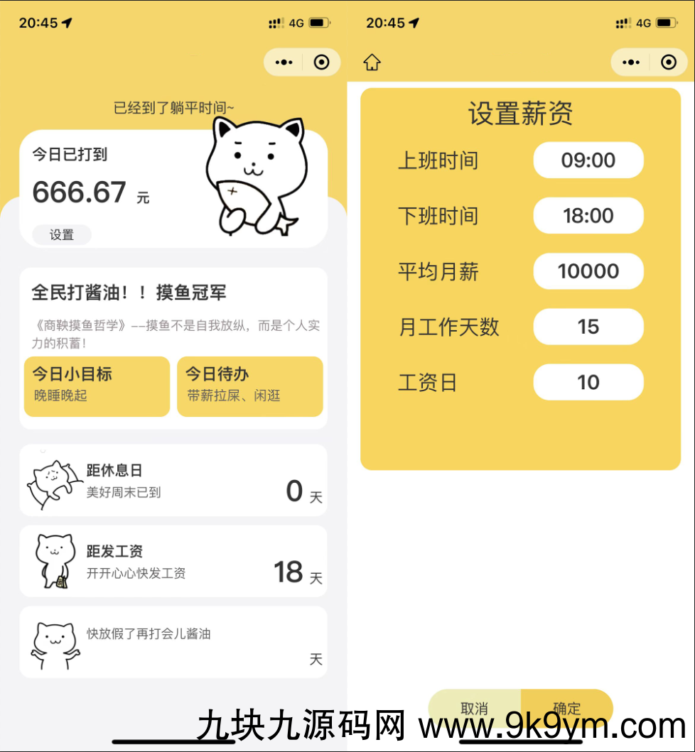 用户进入摸鱼小程序,可以自由设置薪资,上班时间、下班时间、发薪日、