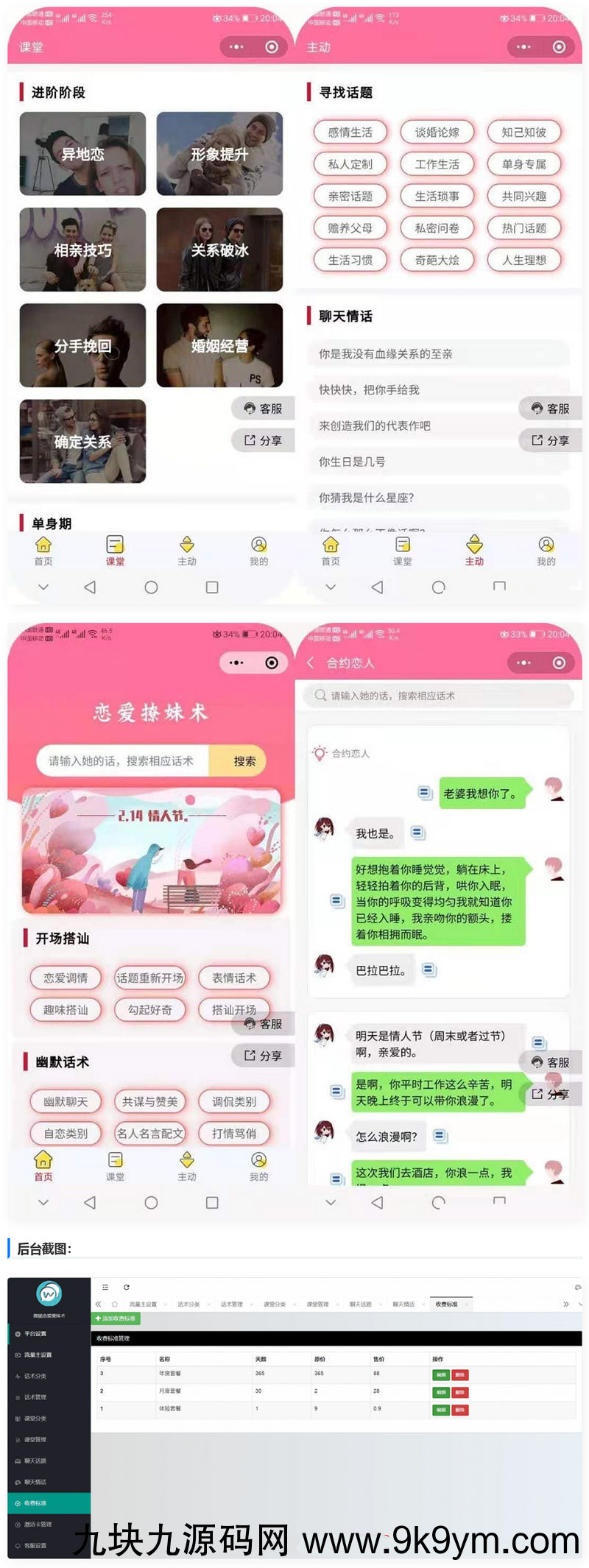 微猫恋爱聊妹术小程序源码 全新主题、全新UI、全方面支持分享朋友圈功能,全新独立后台大更新,让操作更简单!课堂页面、搜索页面、子话术列表页面等,均增加流量主展示,超多功能