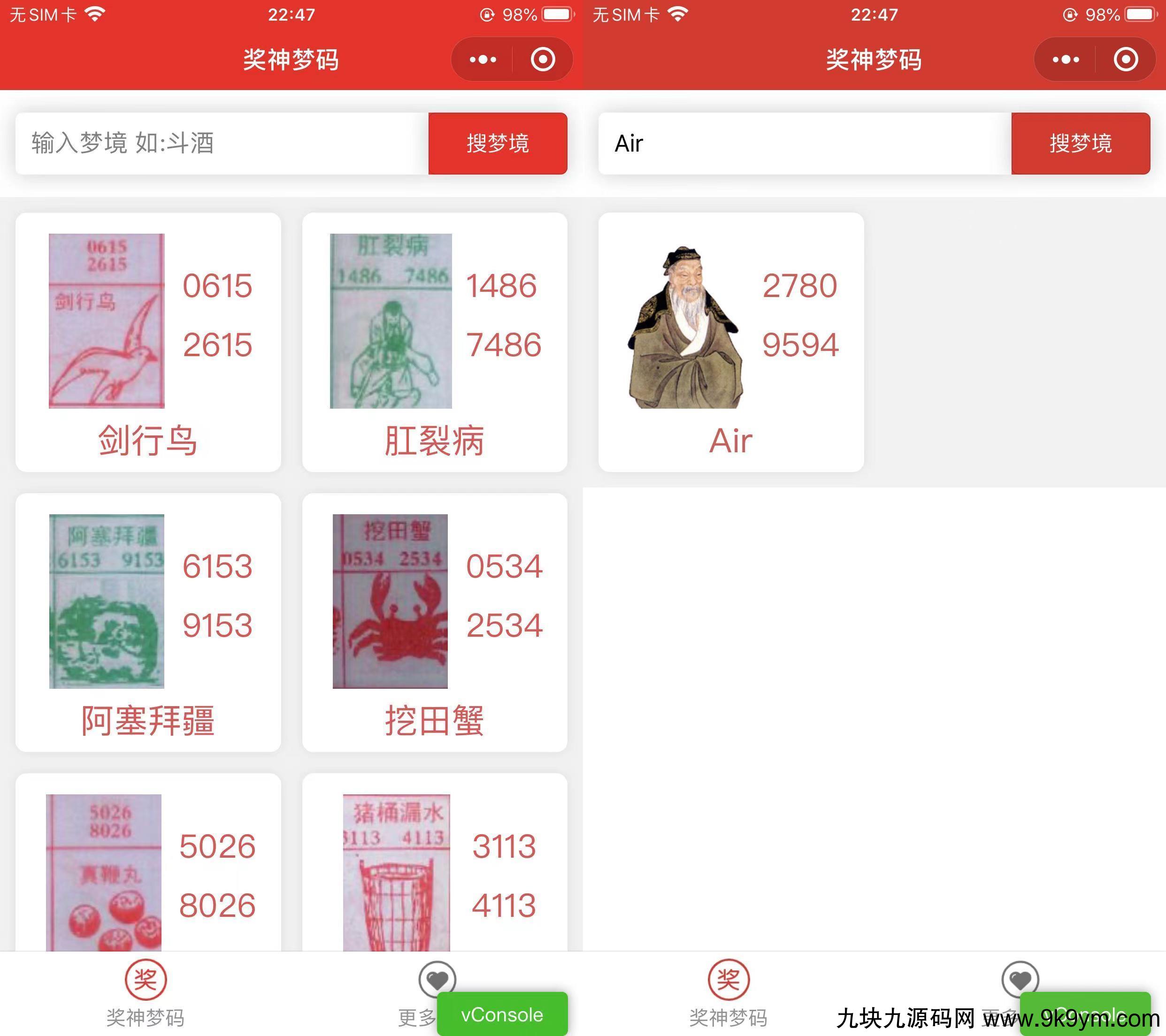 这个小程序的内容对于一般的小伙伴来说可能是一脸懵逼但是对于海南和广东地区的小伙伴来说应该是不陌生因为这两个地区的人可能都打七星彩那些然后有时候经常会做梦那些然后通过做梦的内容来查找对应的数据来打码这款小程序的内容也就是这样,你通过内容来搜索对应的梦境来获取对应的码数好了多介绍无意,因为没什么可玩性对于其它地区来说下面来看看小编的测试演示图吧!