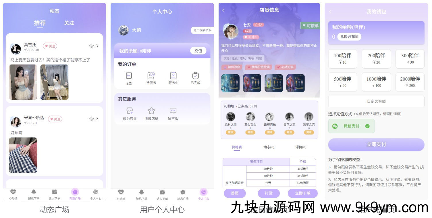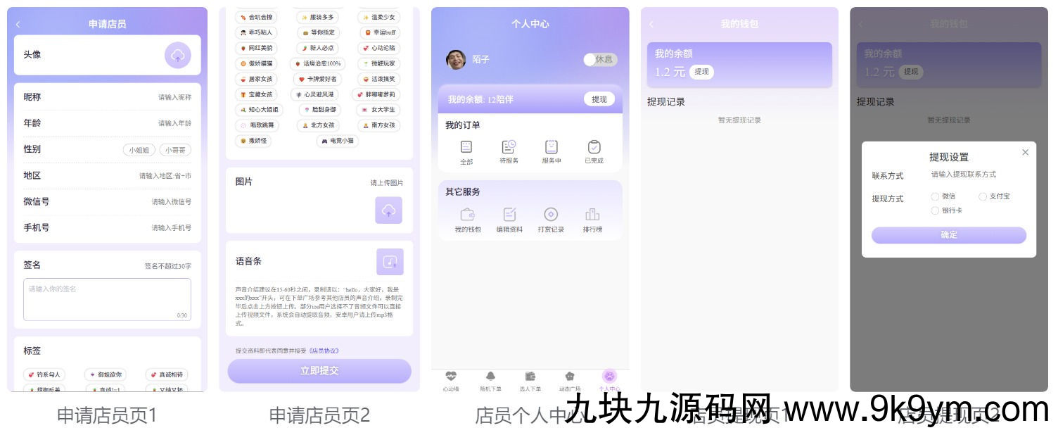 店员申请审核、动态广场审核、业绩统计、订单/打赏抽成自由设置,支持头像装饰、等级配置。